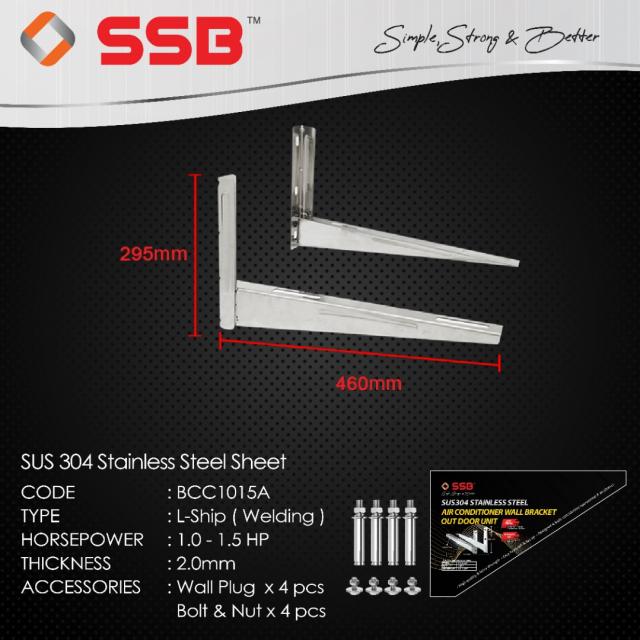 PRODUCT DETAIL OF SSB SUS304 STAINLESS STEEL L-SHIP OUTDOOR BRACKET 1.0-1.5HP MODEL: BCC1015A C/W S/S304 BOLT AND NUT & WALL PLUG (WELDING TYPE)